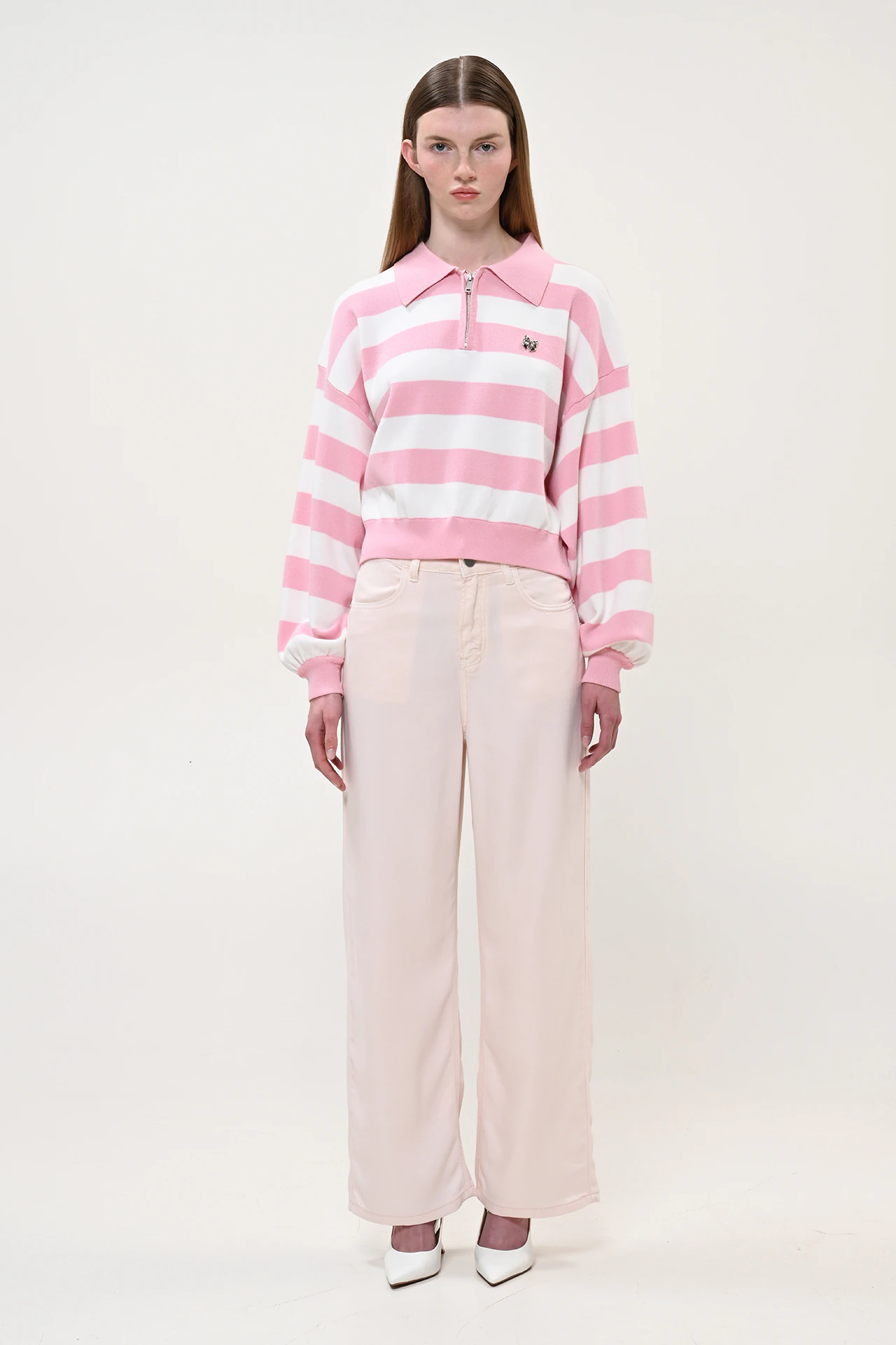Η relaxed γραμμή δίνει μια μοντέρνα προσέγγιση στο κλασικό polo knit. Η διακριτική λεπτομέρεια φιόγκου στο στήθος προσθέτει ένα playful στοιχείο χωρίς να βαραίνει το σύνολο.