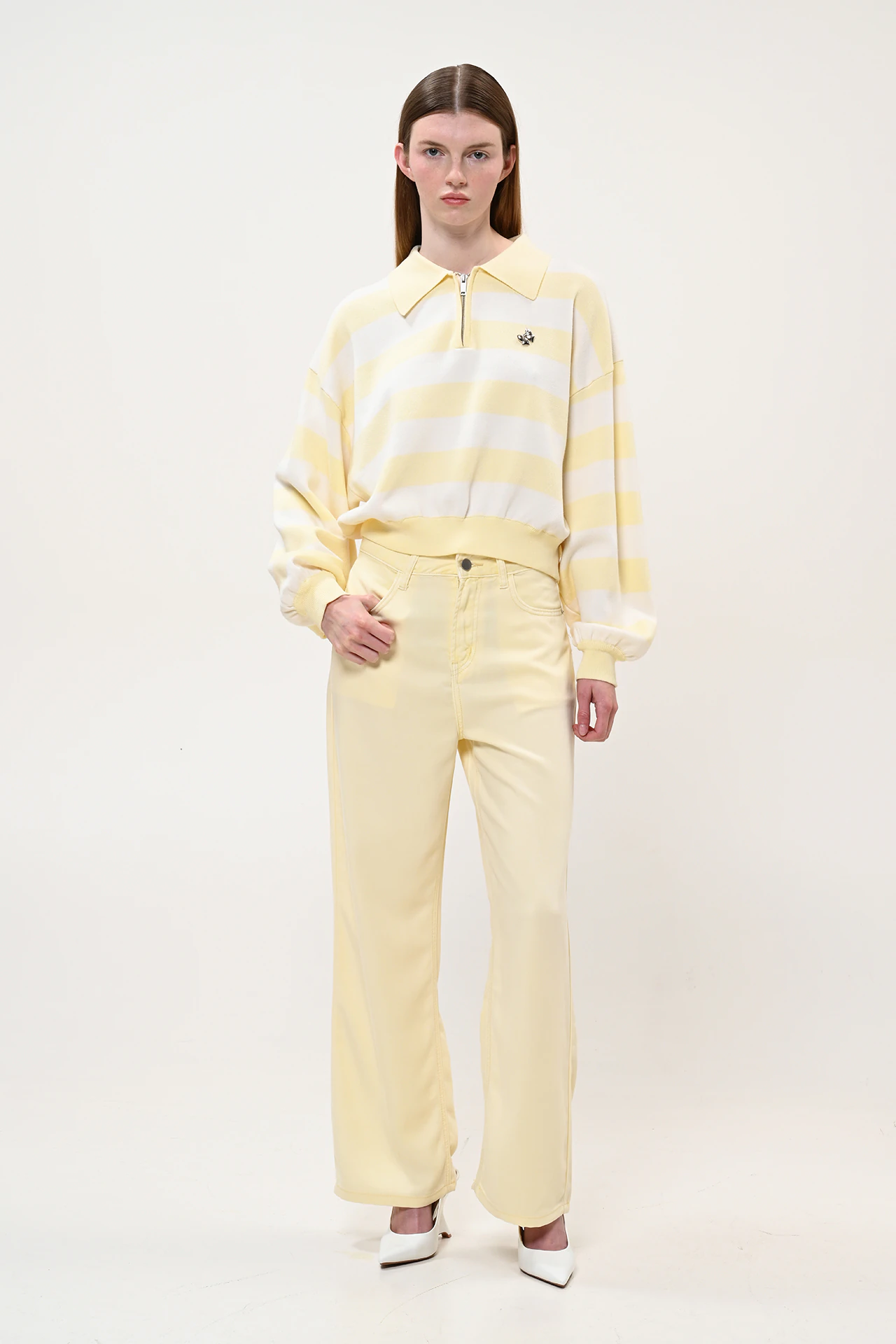 Η relaxed γραμμή δίνει μια μοντέρνα προσέγγιση στο κλασικό polo knit. Η διακριτική λεπτομέρεια φιόγκου στο στήθος προσθέτει ένα playful στοιχείο χωρίς να βαραίνει το σύνολο.