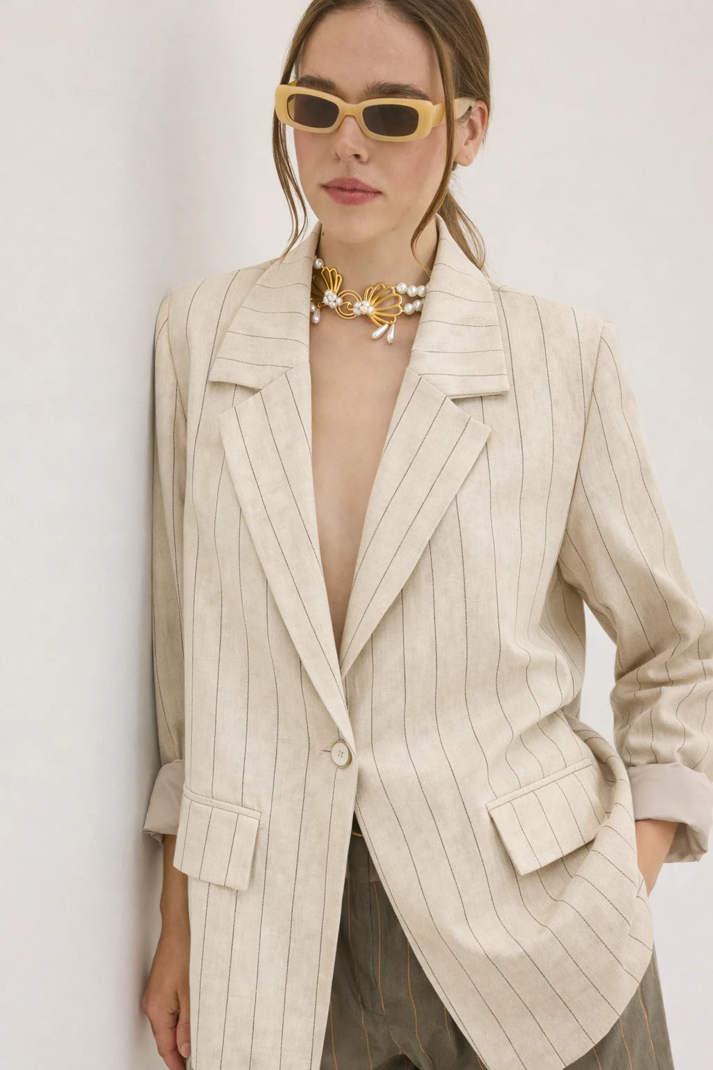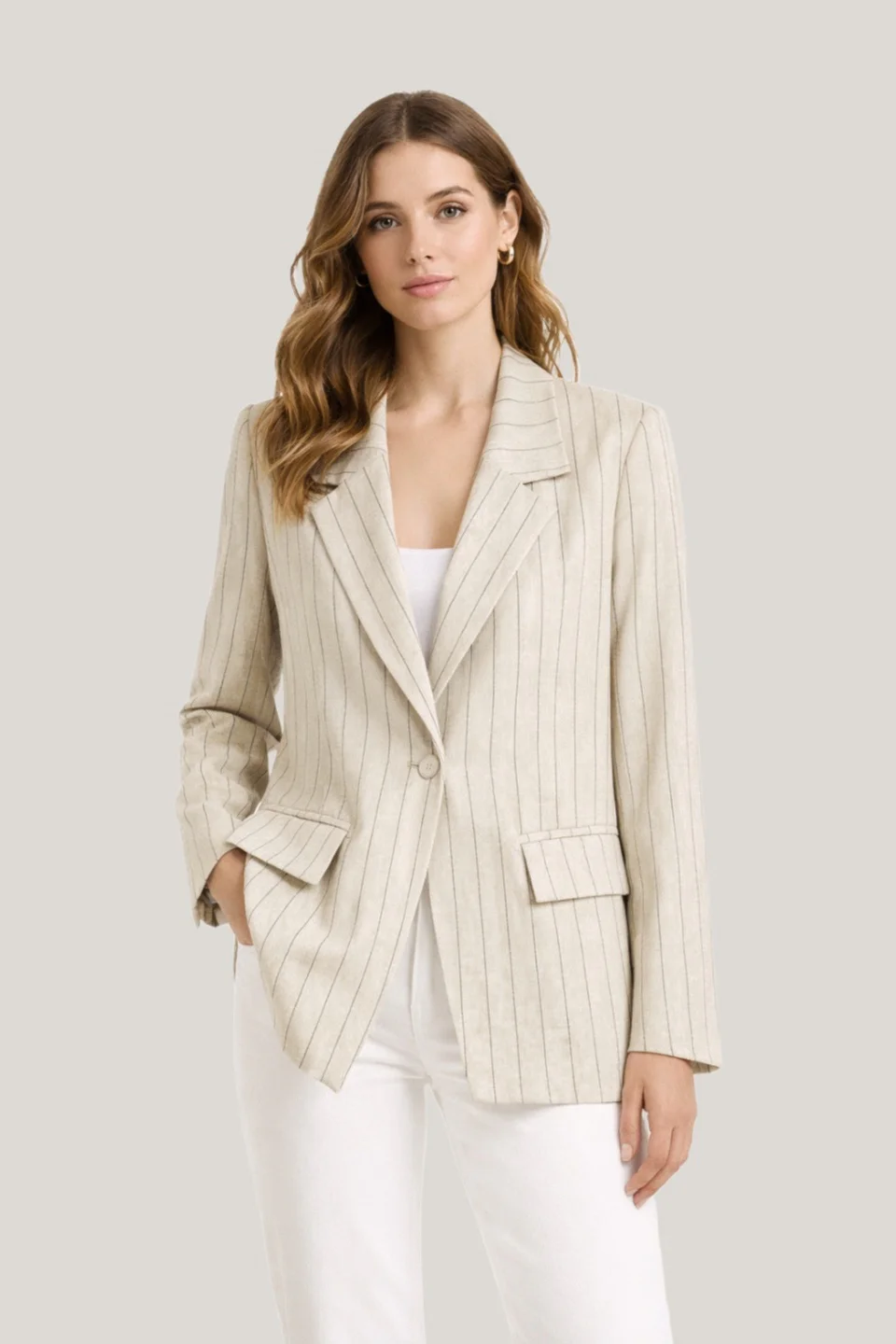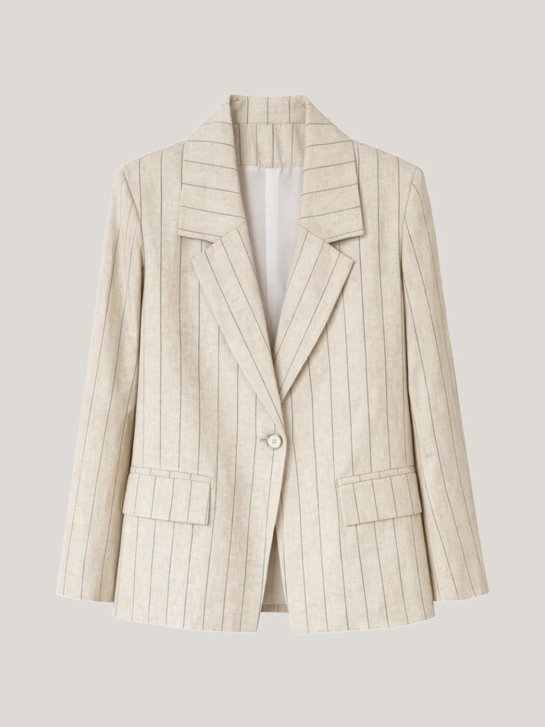 Το Aurelia Pinstripe Blazer της Innocent συνδυάζει τη διαχρονική κομψότητα του tailoring με τη φυσική αίσθηση ενός βαμβακο-λινένιου υφάσματος. Η μπεζ βάση με διακριτικές κάθετες ρίγες δημιουργεί ένα εκλεπτυσμένο, ήσυχο αποτέλεσμα που φοριέται από το πρωί έως το βράδυ.