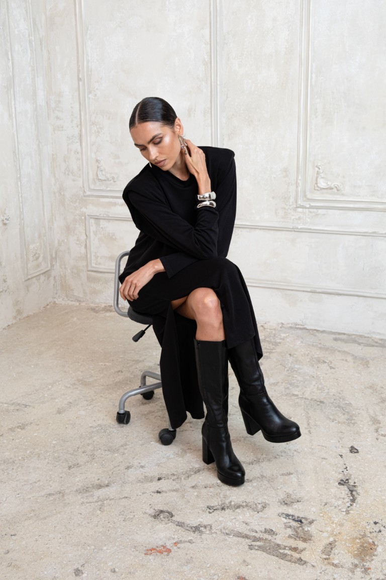 Το Beverly Black Dress από την Teta Arvanitaki είναι ένα κομψό μαύρο φόρεμα με διακριτική ελαστικότητα που αγκαλιάζει το σώμα με άνεση. Διαθέτει μακριά μανίκια, έντονους δομημένους ώμους και ψηλό σκίσιμο στο πλάι, προσθέτοντας μια σύγχρονη, δυναμική πινελιά στη σιλουέτα. Ιδανικό για minimal, chic εμφανίσεις day-to-night.