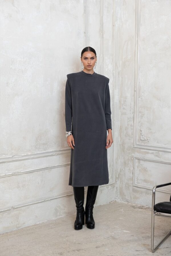 Το Beverly Grey Dress από την Teta Arvanitaki είναι ένα κομψό μαύρο φόρεμα με διακριτική ελαστικότητα που αγκαλιάζει το σώμα με άνεση. Διαθέτει μακριά μανίκια, έντονους δομημένους ώμους και ψηλό σκίσιμο στο πλάι, προσθέτοντας μια σύγχρονη, δυναμική πινελιά στη σιλουέτα. Ιδανικό για minimal, chic εμφανίσεις day-to-night.