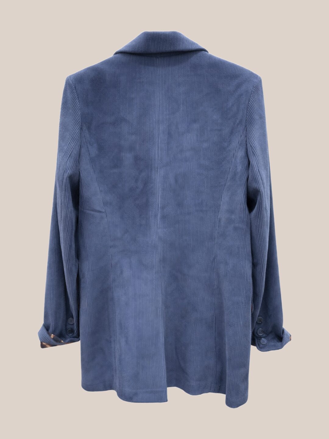 Μπλε κοτλέ μακρύ blazer σε ίσια, άνετη γραμμή με κλασικό πέτο και κουμπί μπροστά. Ξεχωρίζει για τη διακριτική υφή του κοτλέ και τη statement φόδρα με μοτίβο, που αποκαλύπτεται στο εσωτερικό και στα γυρισμένα μανίκια. Ένα κομμάτι που ισορροπεί ανάμεσα στο tailored και το effortless chic.