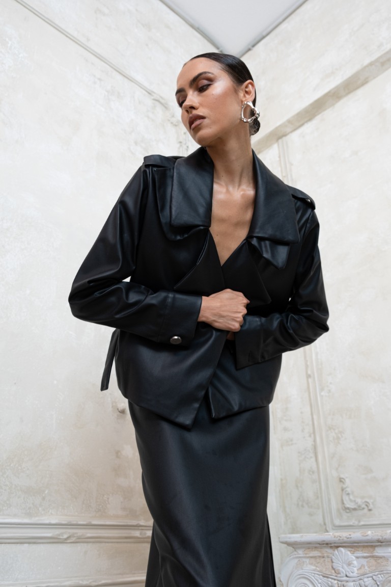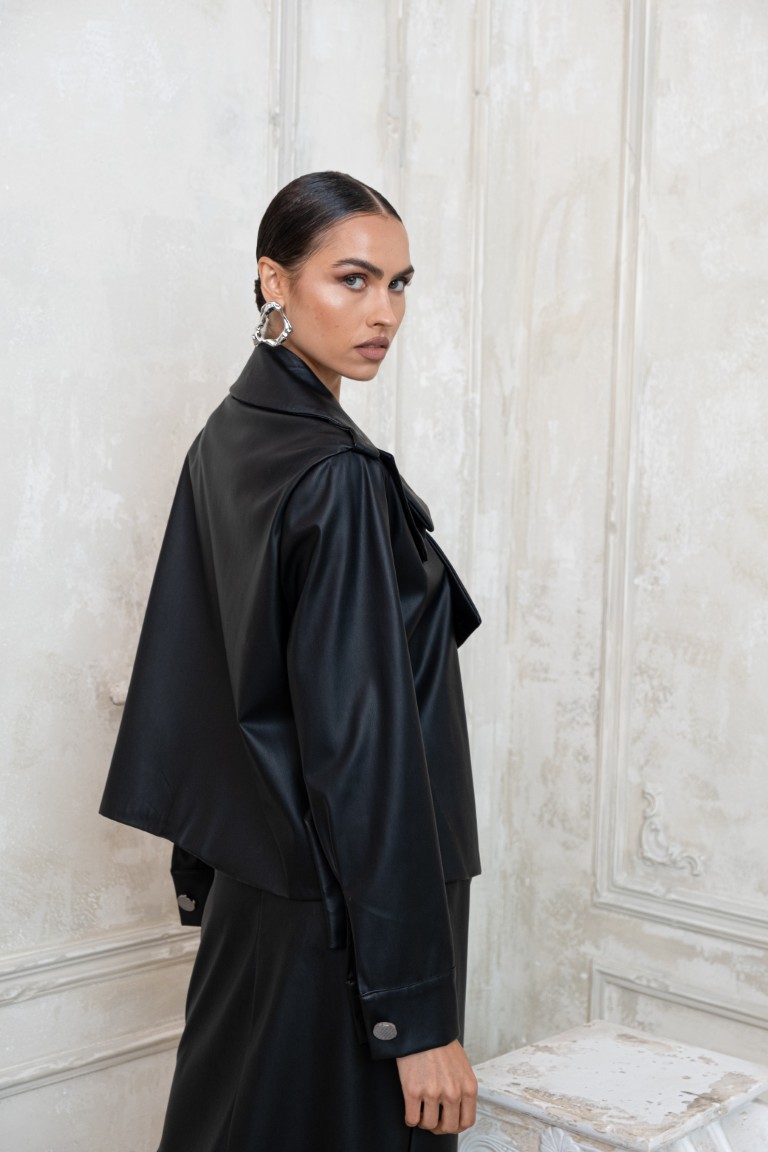 Κοντό μαύρο jacket από οικολογική δερματίνη με oversized γιακά και μοντέρνα χαλαρή γραμμή. Ένα κομψό outerwear που δίνει μια σύγχρονη, δυναμική πινελιά στο look σας.
