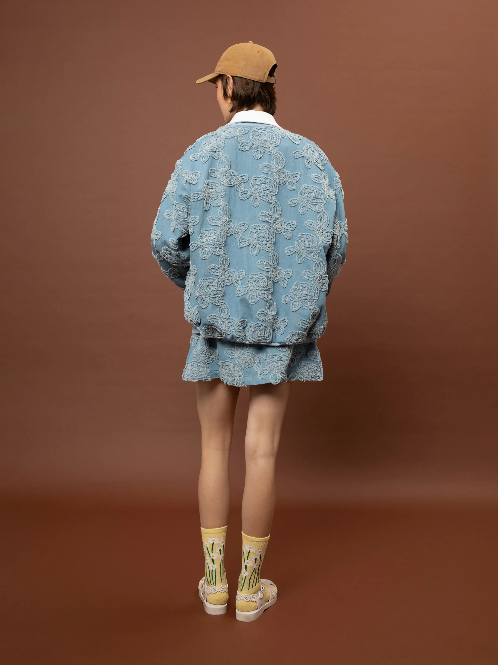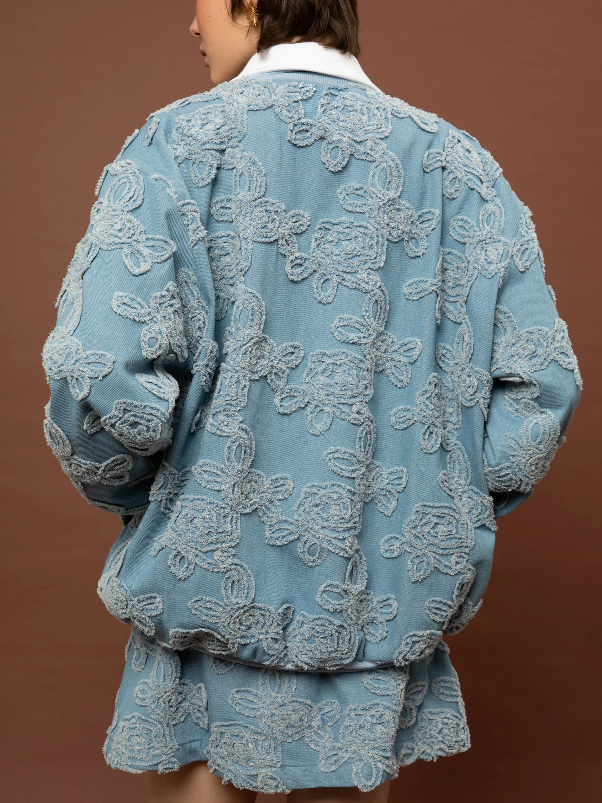 Το βαμβακερό τζιν ύφασμα αναδεικνύεται μέσα από τα ανάγλυφα floral στοιχεία, προσθέτοντας υφή και βάθος χωρίς να χάνει την καθαρότητα της γραμμής. Η bomber σιλουέτα με τις ριμπ λεπτομέρειες διατηρεί το relaxed ύφος, ενώ το φερμουάρ με λογότυπο ολοκληρώνει διακριτικά το design.