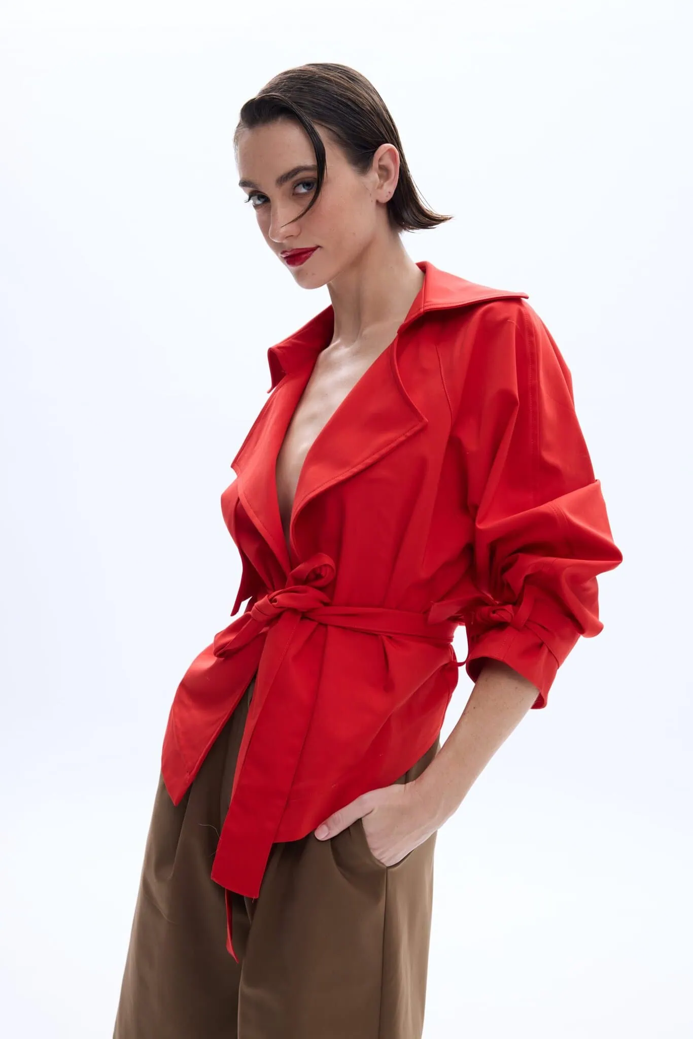 Το ελαφρύ βαμβακερό ύφασμα με ελαστικότητα προσφέρει άνεση και δομή, ενώ τα μανίκια με όγκο και η ζώνη που δένει στη μέση δημιουργούν μια θηλυκή, προσαρμοζόμενη σιλουέτα. Το minimal πέτο ολοκληρώνει το refined design, καθιστώντας το ιδανικό για εμφανίσεις από το πρωί έως το βράδυ.