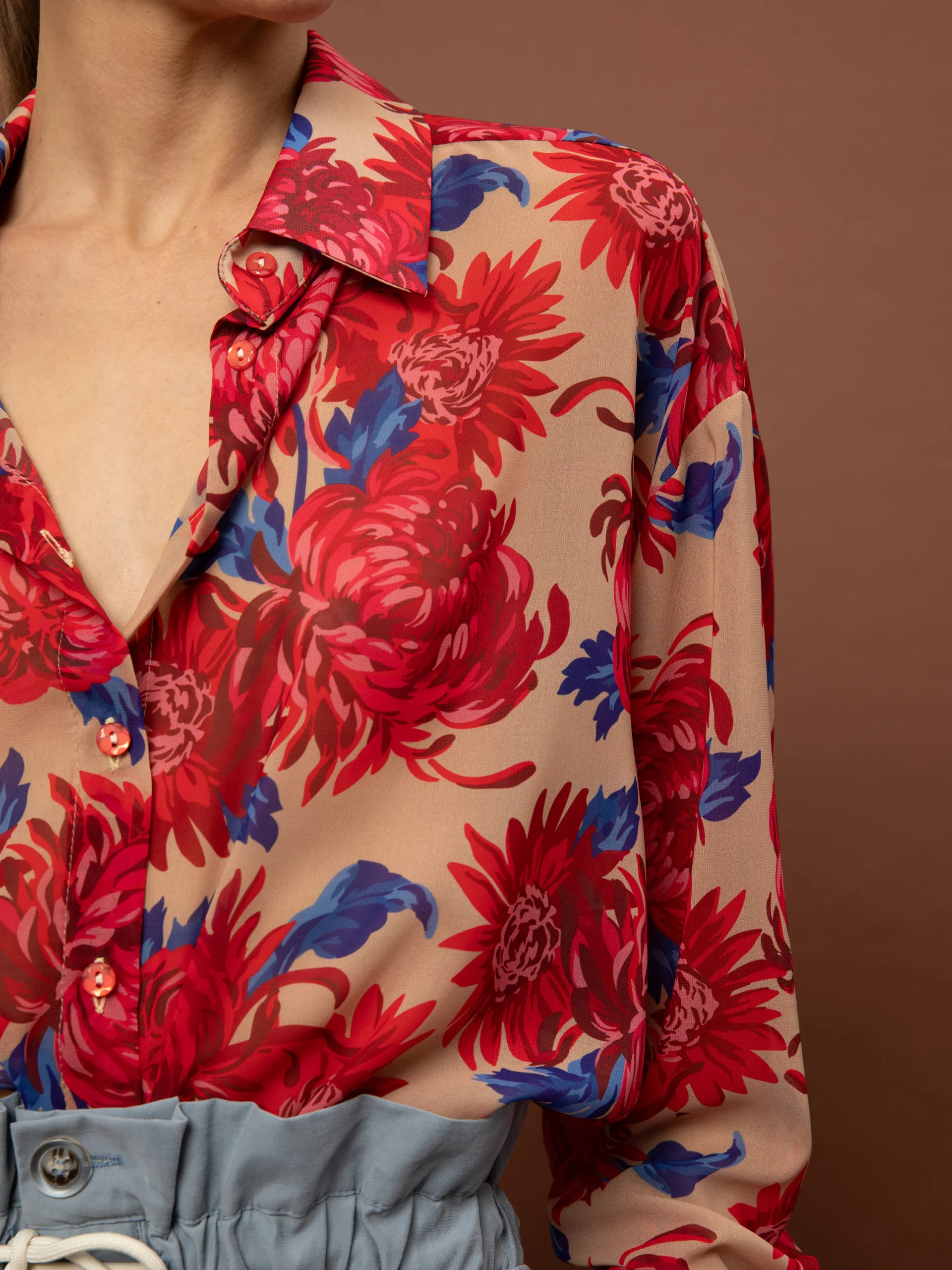 Το Oversized Chiffon Shirt – Chrysanthema Beige της We Are είναι ένα αέρινο εμπριμέ πουκάμισο από ημιδιάφανη μουσελίνα με μεταξένια υφή που χαρίζει κίνηση και κομψότητα σε κάθε εμφάνιση. Το έντονο floral μοτίβο σε beige βάση δημιουργεί ένα ζωηρό και κομψό αποτέλεσμα, ιδανικό για statement εμφανίσεις από το πρωί μέχρι το βράδυ.
