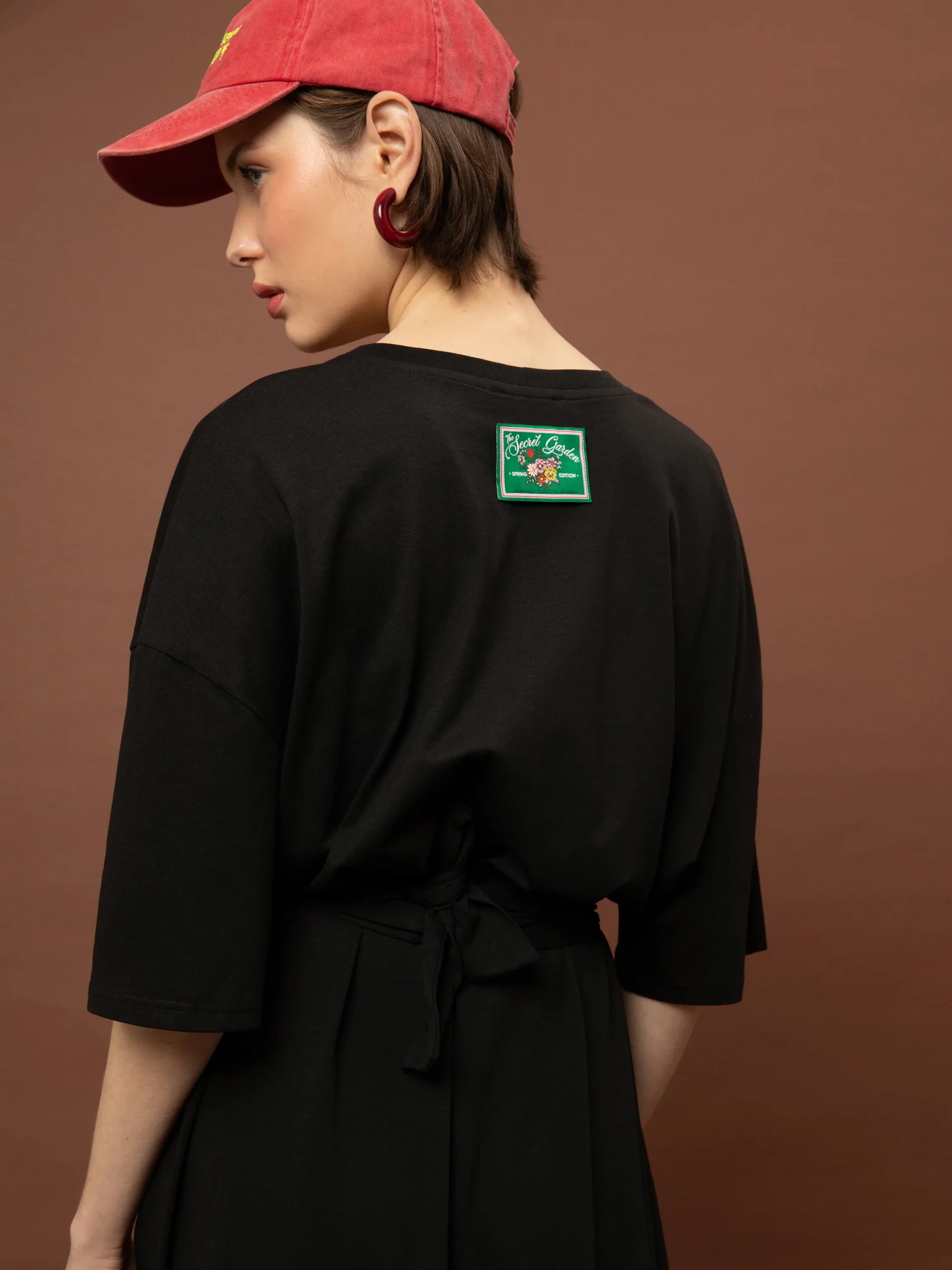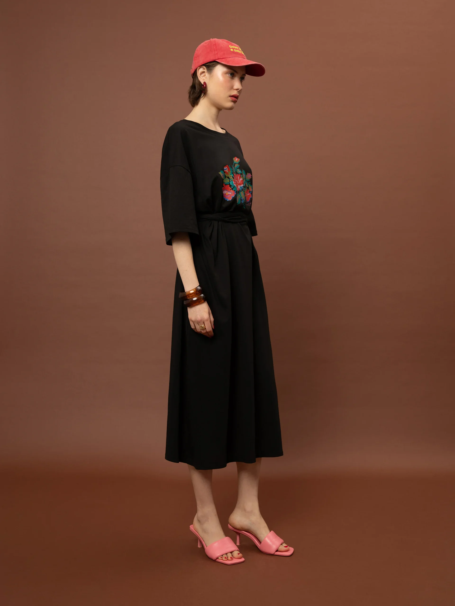 Η minimal μαύρη βάση αναδεικνύεται από τη χαρακτηριστική floral στάμπα στο μπροστινό μέρος, δίνοντας μια καλλιτεχνική πινελιά στο σύνολο. Η αποσπώμενη ζώνη από το ίδιο ύφασμα επιτρέπει να προσαρμόσετε τη γραμμή του φορέματος στη μέση, δημιουργώντας είτε πιο χαλαρό είτε πιο δομημένο αποτέλεσμα.