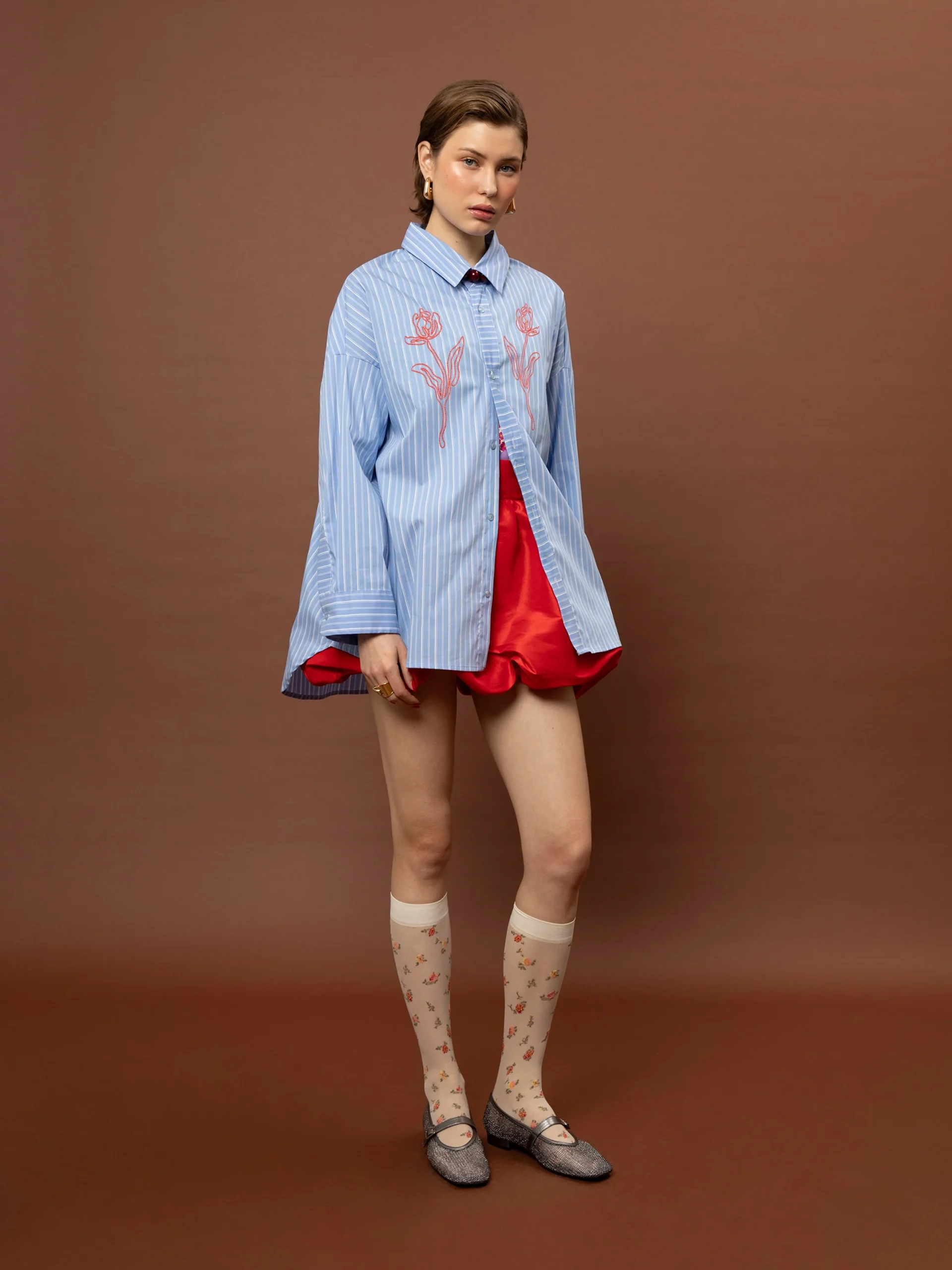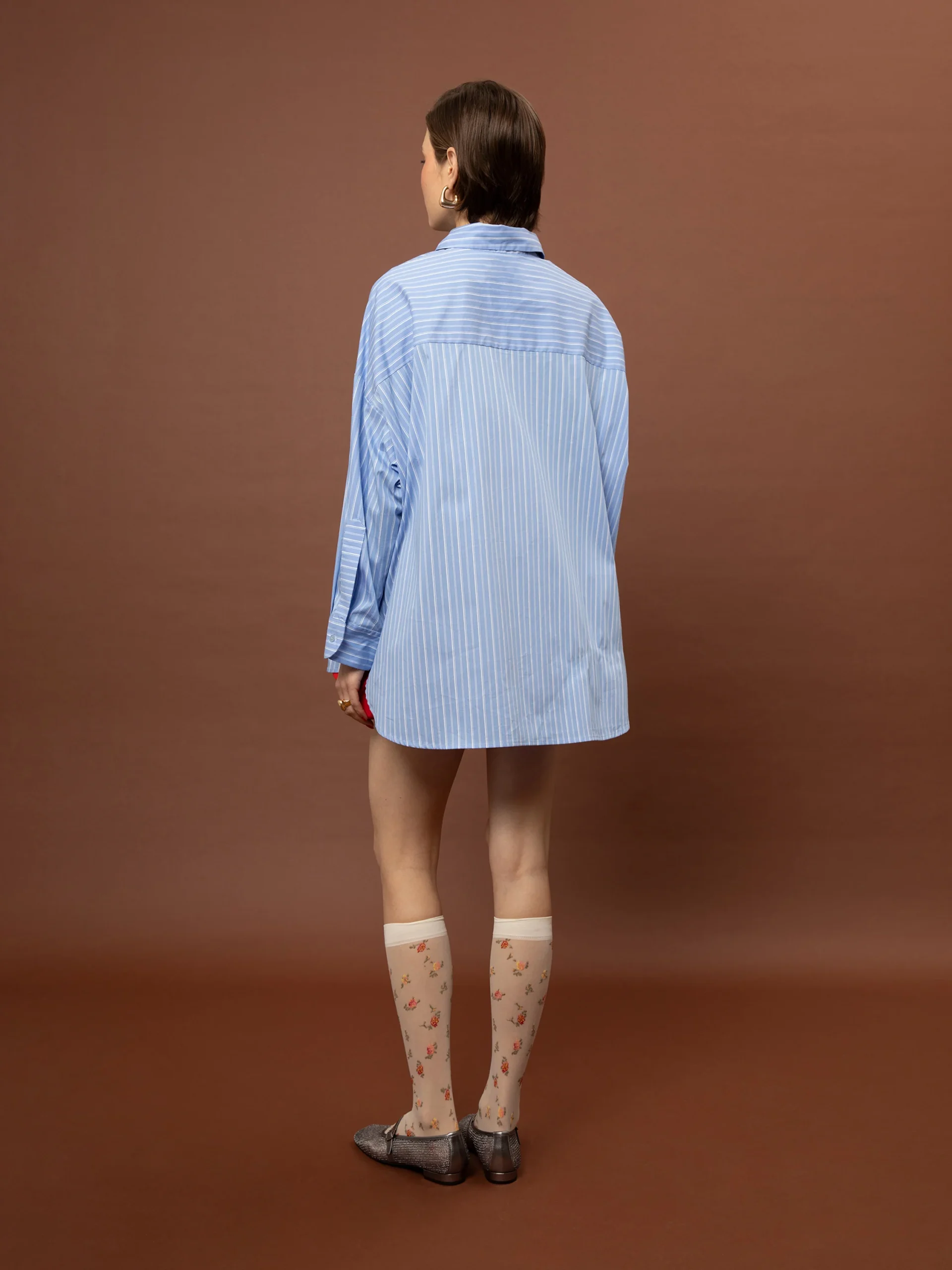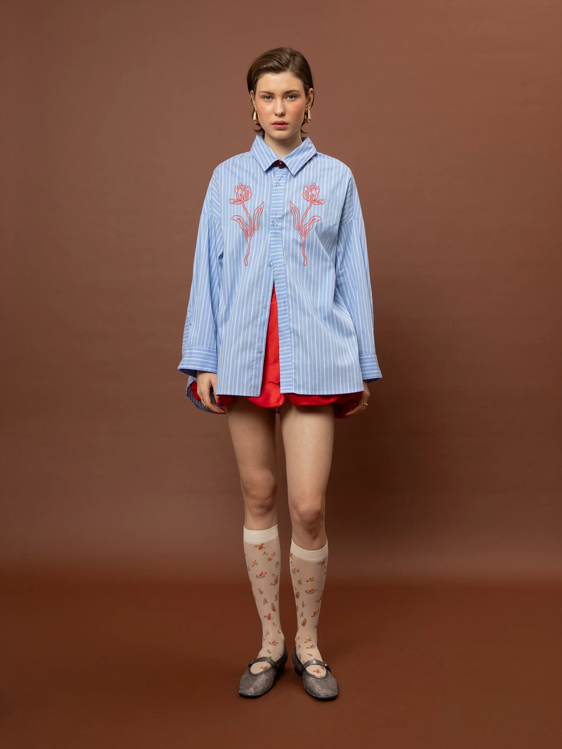 Το Oversized Striped Shirt – Light Blue από τη We Are επαναπροσδιορίζει το κλασικό ριγέ πουκάμισο μέσα από μια relaxed, σύγχρονη προσέγγιση. Η ανάλαφρη βαμβακερή σύνθεση συνδυάζεται με λεπτές κάθετες ρίγες, δημιουργώντας μια καθαρή βάση, ενώ το ανάγλυφο floral τύπωμα στο στήθος προσθέτει ένα διακριτικό αλλά χαρακτηριστικό design element. Η oversized γραμμή προσφέρει άνεση και ευελιξία στο styling. Φοριέται είτε ως βασικό κομμάτι είτε ως layering piece, από πρωινά looks μέχρι πιο elevated εμφανίσεις.