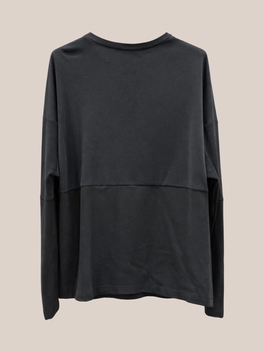 Μαύρο μακρυμάνικο τοπ της Innocent, σε χαλαρή γραμμή με καθαρές γραμμές και minimal αισθητική. Η διακριτική οριζόντια ραφή στο μπροστινό και πίσω μέρος προσθέτει ενδιαφέρον χωρίς να βαραίνει το σχέδιο, ενώ το απαλό ύφασμα εξασφαλίζει άνεση και φυσική κίνηση. Ένα ευέλικτο κομμάτι για καθημερινό, effortless styling.