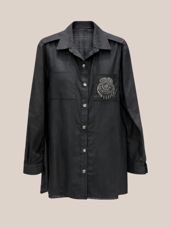 Μαύρο πουκάμισο σε χαλαρή γραμμή με σύγχρονη, utility αισθητική. Διαθέτει επωμίδες στους ώμους, μπροστινά τσεπάκια και ιδιαίτερο, μη αποσπώμενο διακοσμητικό στοιχείο στο ένα τσεπάκι που προσθέτει μοναδικό χαρακτήρα. Η καρώ πλάτη και η καρώ φόδρα δημιουργούν αντίθεση και βάθος, καθιστώντας το ένα ξεχωριστό κομμάτι για layered και statement εμφανίσεις.