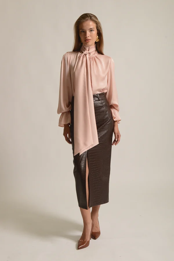 Κομψή σατέν μπλούζα της Twenty-29 σε απαλή σομόν απόχρωση, με ψηλό γιακά που δένει μπροστά και δημιουργεί φίνα, ρευστή γραμμή. Το ύφασμα έχει απαλή, μεταξένια υφή και διακριτική γυαλάδα που αναδεικνύει τη θηλυκότητα του σχεδίου. Τα μανίκια καταλήγουν σε λάστιχο που σχηματίζει διακριτικό βολάν, προσθέτοντας κίνηση και κομψότητα.