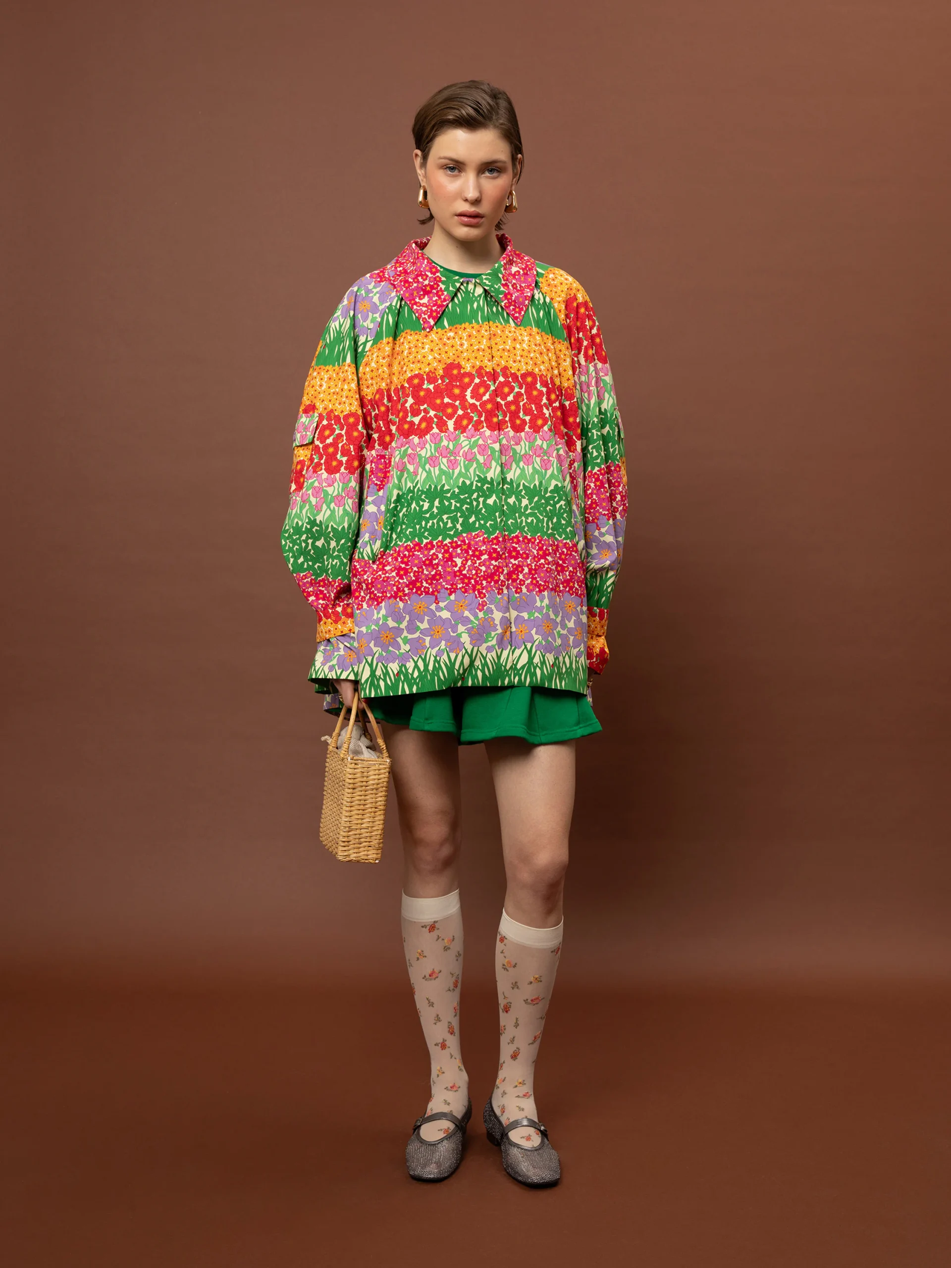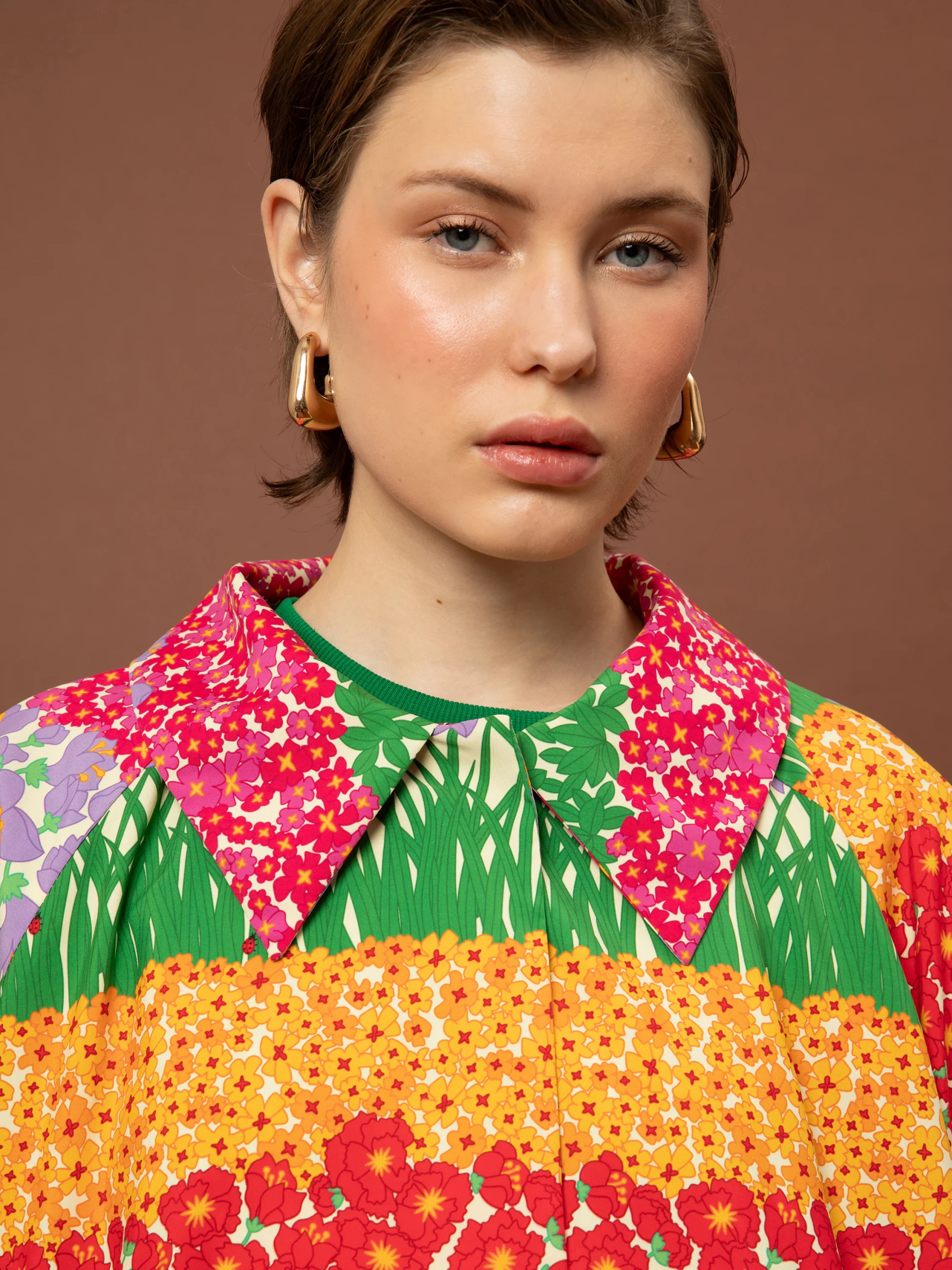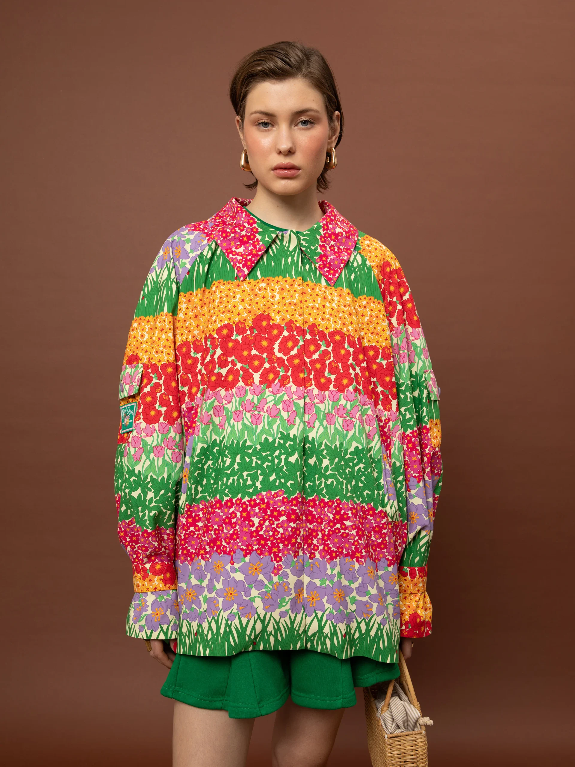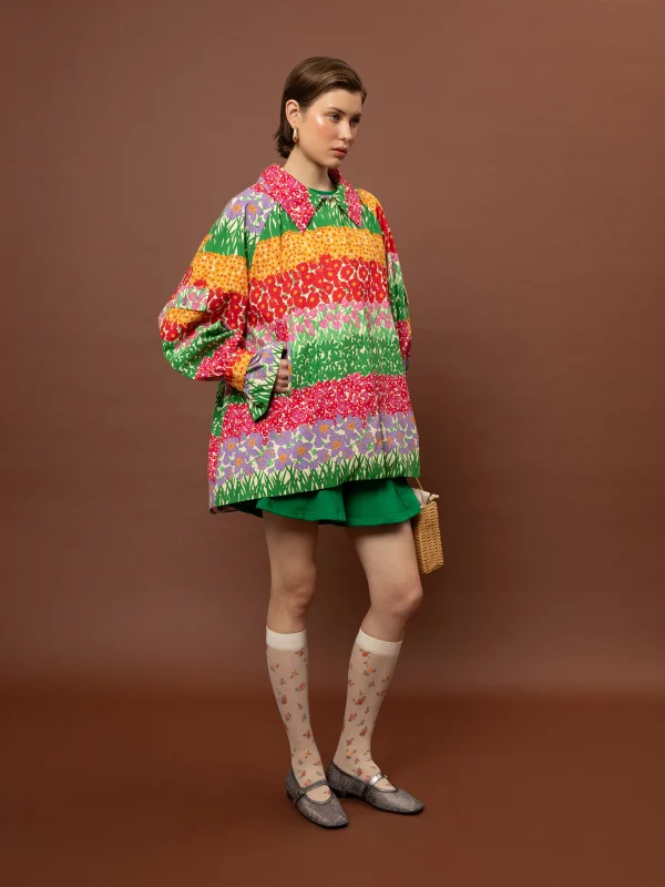 Το ιδιαίτερο floral μοτίβο αποτυπώνεται σε layered συνθέσεις χρώματος, δημιουργώντας ένα κομμάτι με έντονο χαρακτήρα και artistic διάθεση. Η κοντή γραμμή και ο κλασικός γιακάς ισορροπούν το statement print, ενώ το κρυφό κούμπωμα διατηρεί την καθαρότητα του design.