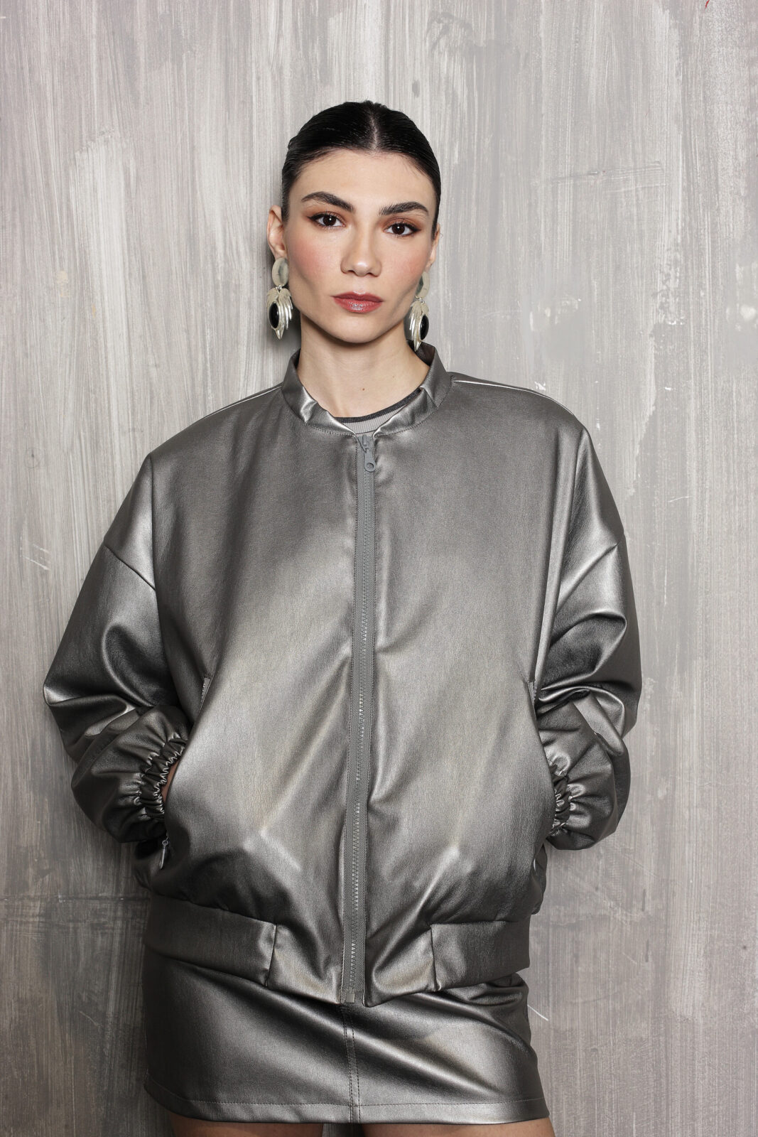 Ασημί bomber jacket με δερμάτινη υφή και minimal γραμμή που χαρίζει δυναμικό, μοντέρνο χαρακτήρα σε κάθε εμφάνιση. Tο άνετο κόψιμο το κάνει ιδανικό τόσο για καθημερινές όσο και για πιο fashion-forward επιλογές.
