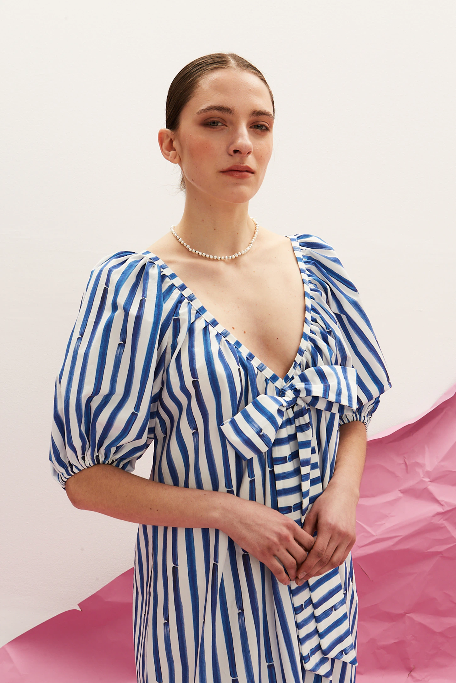 Η βαθιά V λαιμόκοψη, μπροστά και πίσω, συνδυάζεται με έντονα puff μανίκια και ένα oversized φιόγκο στο στήθος που λειτουργεί ως κεντρικό design στοιχείο. Η γραμμή είναι αέρινη και χαλαρή, δημιουργώντας ένα silhouette που κινείται φυσικά και ξεχωρίζει χωρίς προσπάθεια.