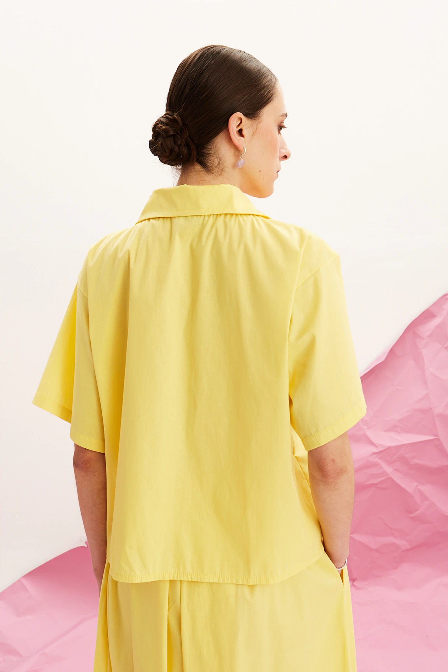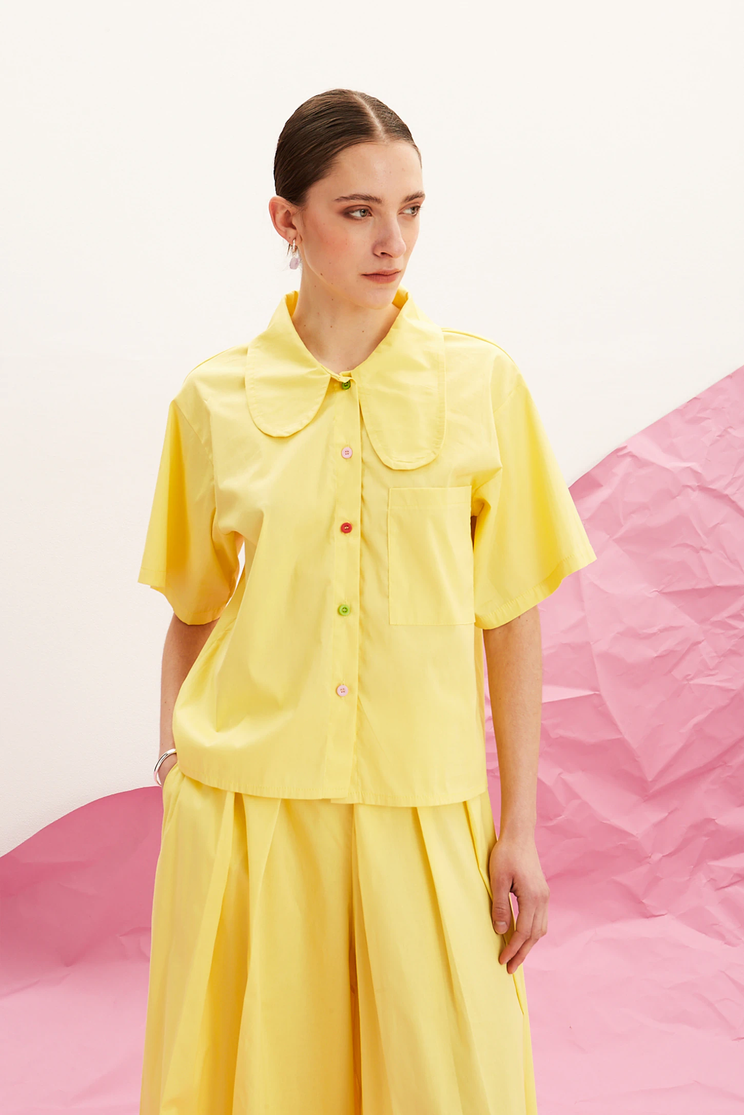 Το The Flower Collar Shirt της The Norm σε απόχρωση Butter Yellow επαναπροσδιορίζει το κλασικό κοντομάνικο πουκάμισο μέσα από μια πιο καλλιτεχνική και παιχνιδιάρικη προσέγγιση. Ο ξεχωριστός, oversized γιακάς, διαμορφωμένος σε αφαιρετικό σχήμα λουλουδιού, δίνει στο κομμάτι έναν γλυπτικό χαρακτήρα με έντονη προσωπικότητα.