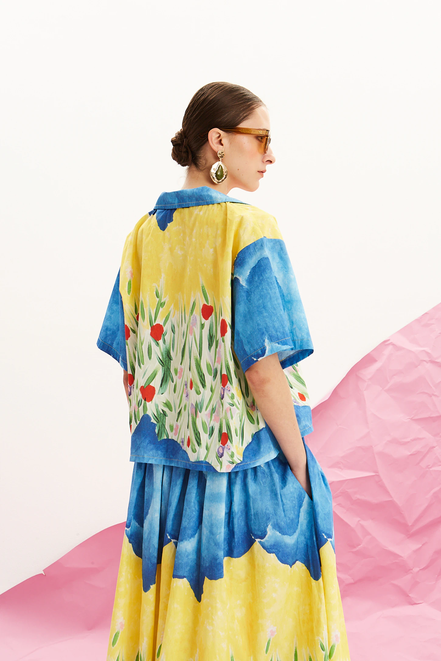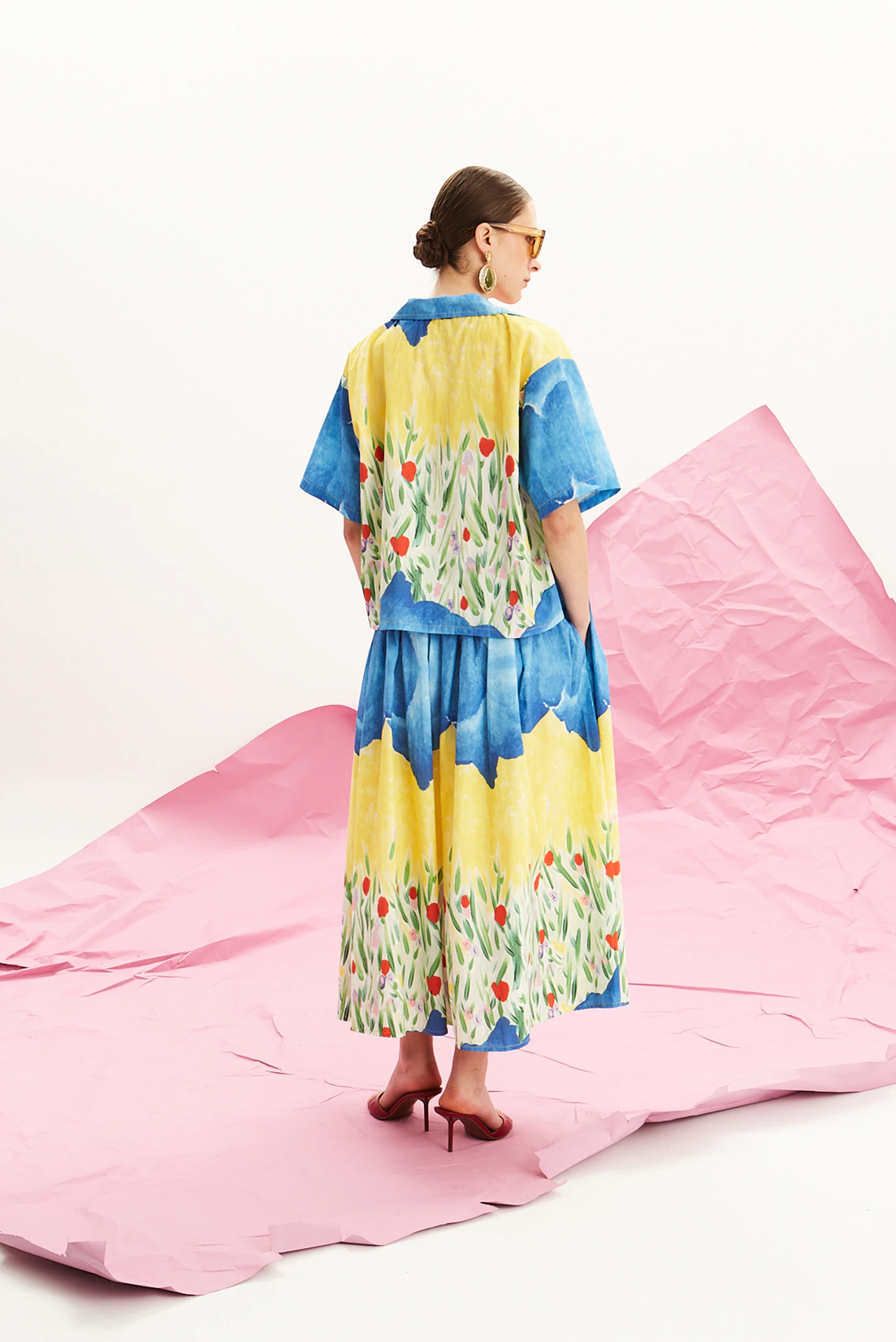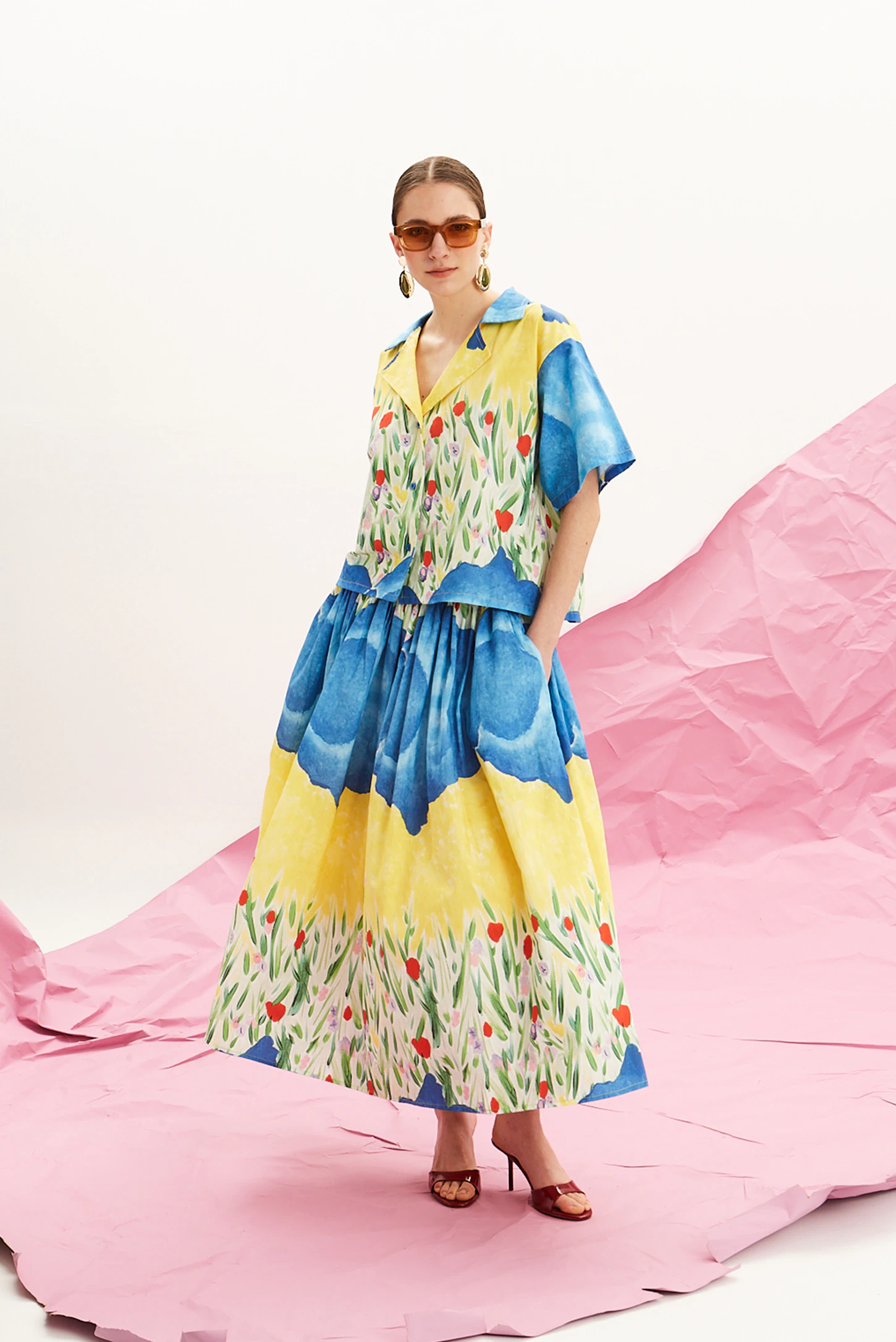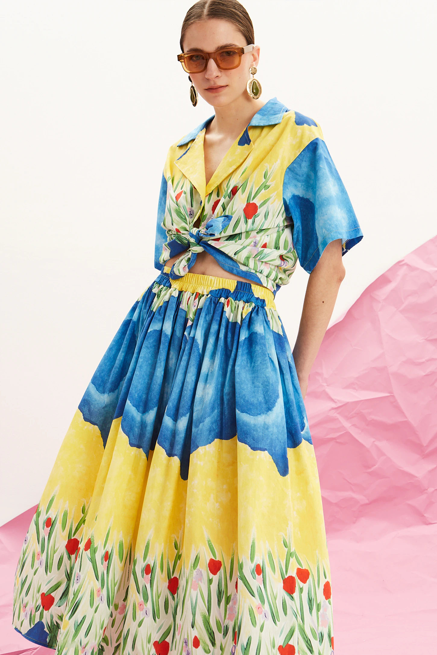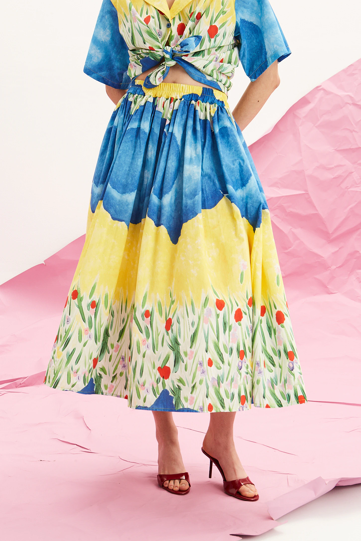 Η The Long Skirt – Efflorescence της The Norm αποτυπώνει μια ζωντανή, καλλιτεχνική σύνθεση όπου το τοπίο μεταφράζεται σε ένδυμα. Το αποκλειστικό, hand-painted μοτίβο αναπτύσσεται σαν μια εικαστική αφήγηση όπου το έντονο μπλε του ουρανού συναντά ένα πεδίο από ζωηρά, ζωγραφισμένα άνθη.