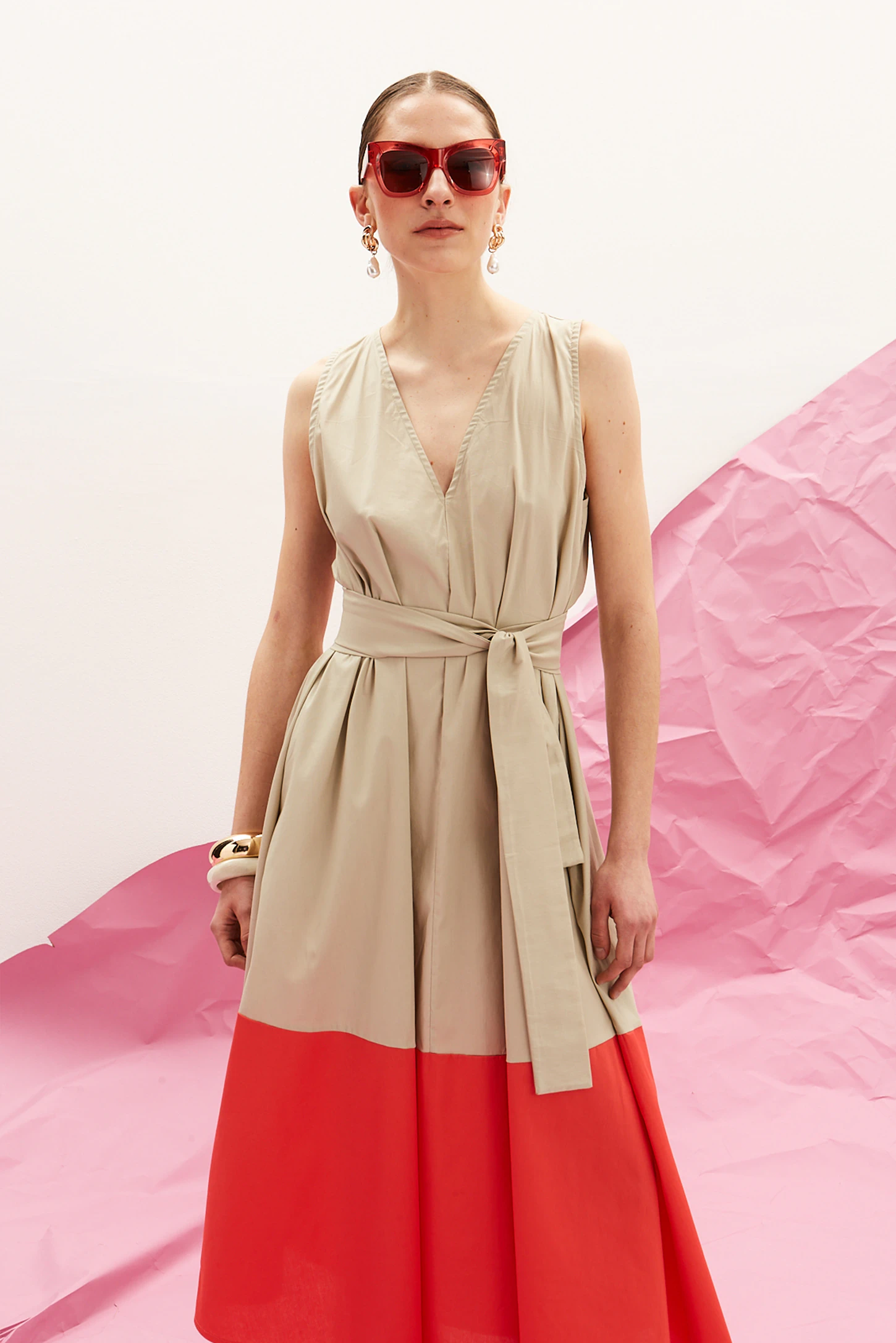 Κατασκευασμένο από 100% βαμβακερή ποπλίνα, διαθέτει βαθύ V ντεκολτέ και oversized A-line σιλουέτα που κινείται φυσικά στο σώμα. Το χαρακτηριστικό color-block τελείωμα προσθέτει μια σύγχρονη, δυναμική πινελιά, ενώ η αποσπώμενη ζώνη επιτρέπει ευελιξία στο styling — από loose, ρευστή γραμμή έως πιο τονισμένη μέση.