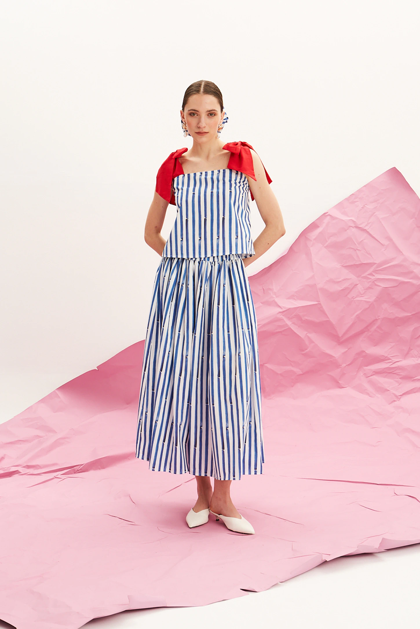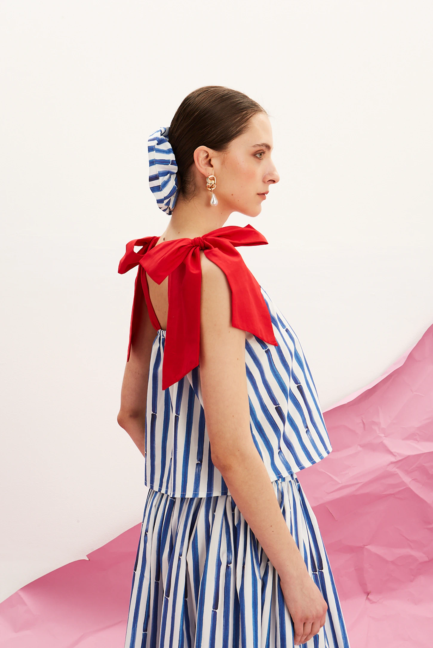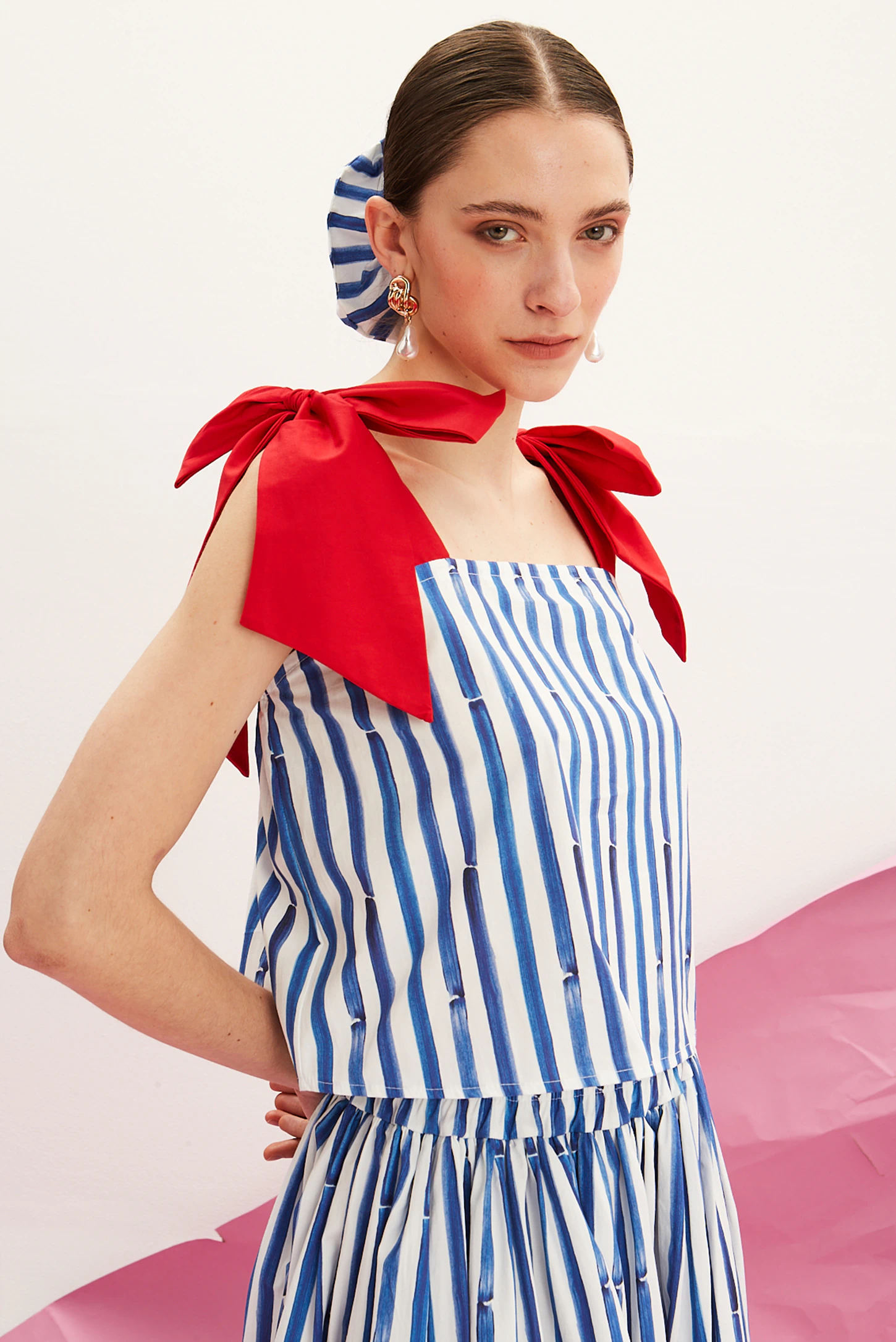Κατασκευασμένο από 100% cotton poplin, διατηρεί μια καθαρή, δομημένη φόρμα, ενώ οι oversized κόκκινοι φιόγκοι στους ώμους λειτουργούν ως το signature στοιχείο του σχεδίου. Ρυθμιζόμενοι και έντονα γλυπτικοί, επιτρέπουν να προσαρμόσεις τόσο την εφαρμογή όσο και την ένταση του look.