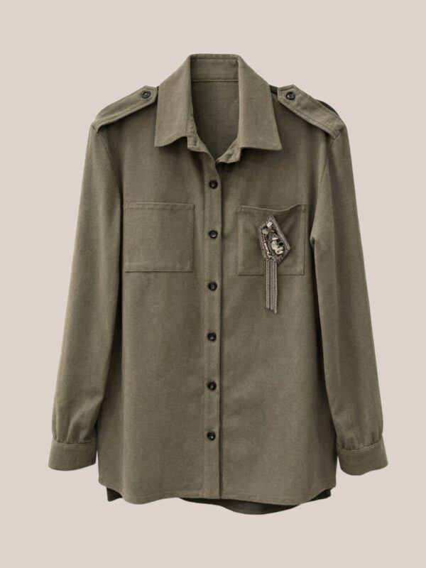 Το Two Tone Utility Shirt της Innocent αποτυπώνει σύγχρονη utility αισθητική με καθαρές γραμμές και ισορροπημένη διχρωμία. Η χακί μπροστινή όψη συνδυάζεται με μαύρη πλάτη, δημιουργώντας διακριτικό contrast και βάθος. Οι επωμίδες και τα μπροστινά τσεπάκια ενισχύουν τον σύγχρονο χαρακτήρα του σχεδίου, ενώ το μη αποσπώμενο διακοσμητικό στοιχείο στο ένα τσεπάκι προσθέτει μοναδική ταυτότητα.